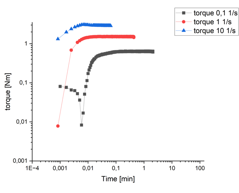 The measurement is performed by an sudden change in angular velocity or shear rate, also referred to as a step shear test. The response to the imposed shear rate is the measured torque, which provides the shear stress as a function of time. The viscosity approaches equilibrium after a long enough time, as shown in Figure 1.