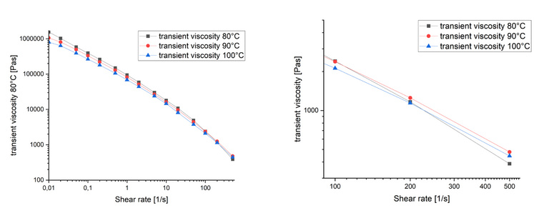 Figure 4 shows the temperature dependence of the transient viscosity. If dissipation is not considered, the viscosity measured at lower test temperatures can appear lower than that measured at higher temperatures due to strong shear heating. In this example, the uncorrected data at 80 °C lie below those at 90 °C and 100 °C. Such data would therefore not be used in a temperature shift analysis.