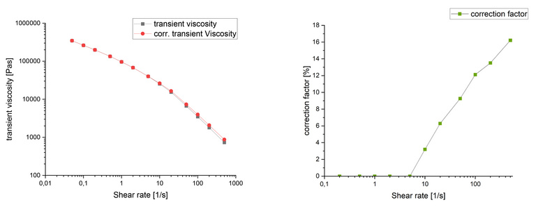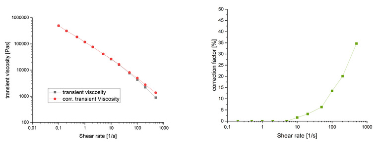 Figure 2 compares the transient viscosity measured with and without shear heating correction for a highly viscous EPDM compound. The uncorrected viscosity curve shows a kink. In this example, the temperature increase of the sample reduces the viscosity by up to 40%.