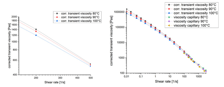 The corrected data in Figure 5 show the proper temperature ranking. These data can be compared with results from a high-pressure capillary rheometer — in this case, an RG50 with Contifeed. The capillary rheometer data are fully corrected, enabling a good correlation. In practice, however, not all corrections can always be applied. The transient viscosity measurement therefore provides an effective complement and enables process-relevant testing, including the analysis of slip and adhesion behavior in pressure flow within the capillary rheometer.